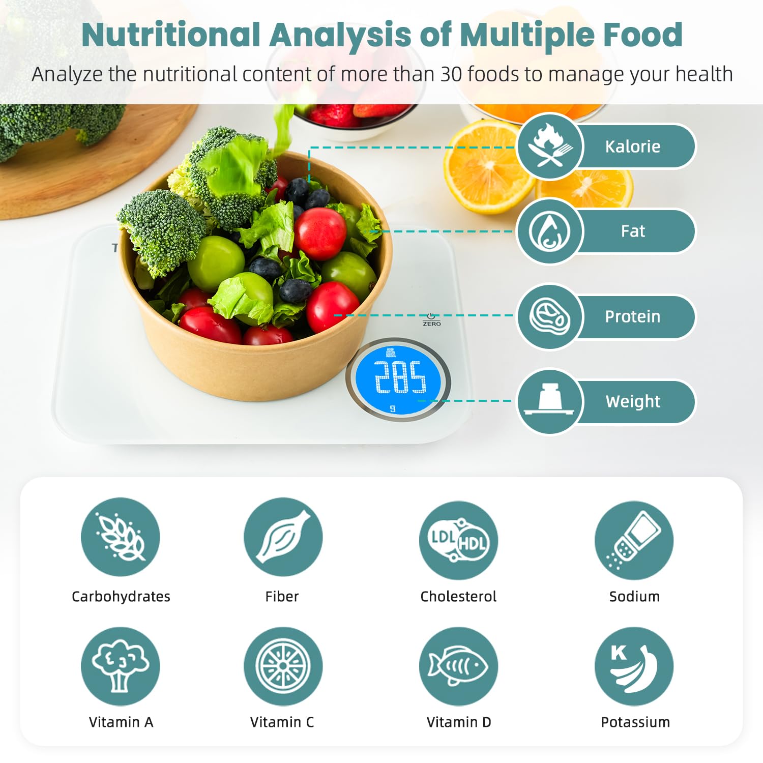 Personalized Nutrition Assistant: Elevate your culinary experience with the smart food scale, unlock a personalized nutrition assistant that support analysis of a variety of food nutrients, such as Protein, Calorie, Fat, Sugar intake, etc