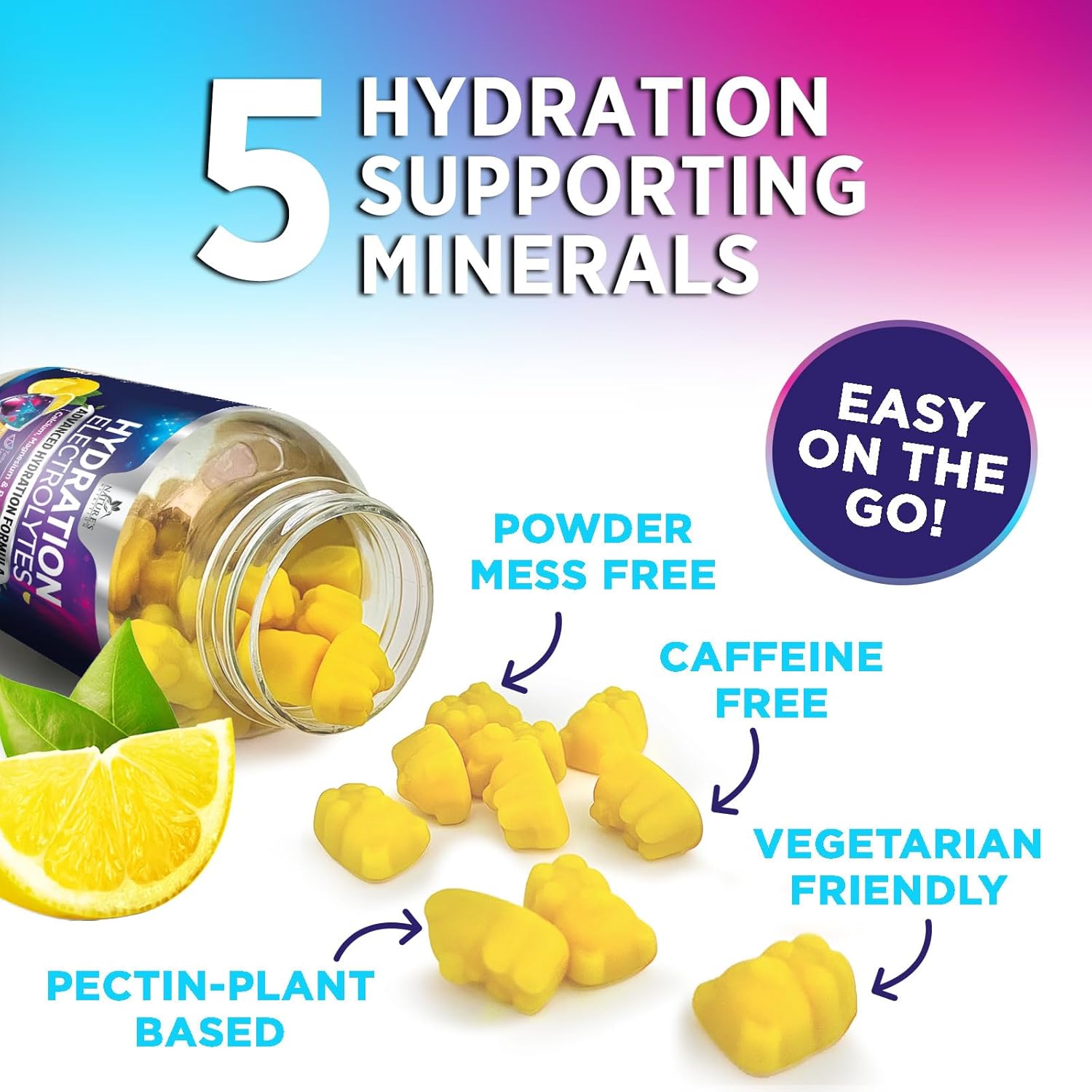 POWERFUL FORMULA WITH REAL INGREDIENTS: Skip the mess of electrolyte drink mixes and enjoy these vegan, non GMO gummies; They deliver a clean hydration supplement with premium minerals and natural lemon flavor, making them a refreshing and effective choice for replenishing electrolytes